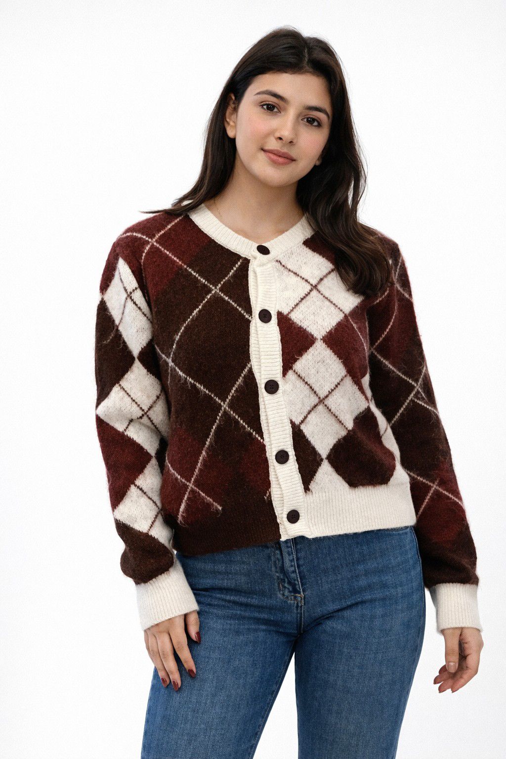 A classic argyle knit cardigan designed with a soft texture, button-down front, and a comfortable everyday fit. Timeless and versatile, this piece is perfect for layering through all seasons.