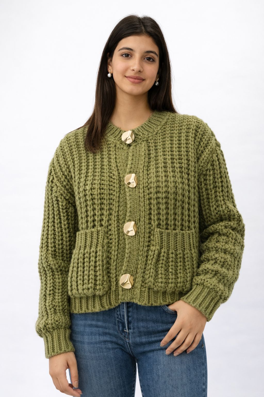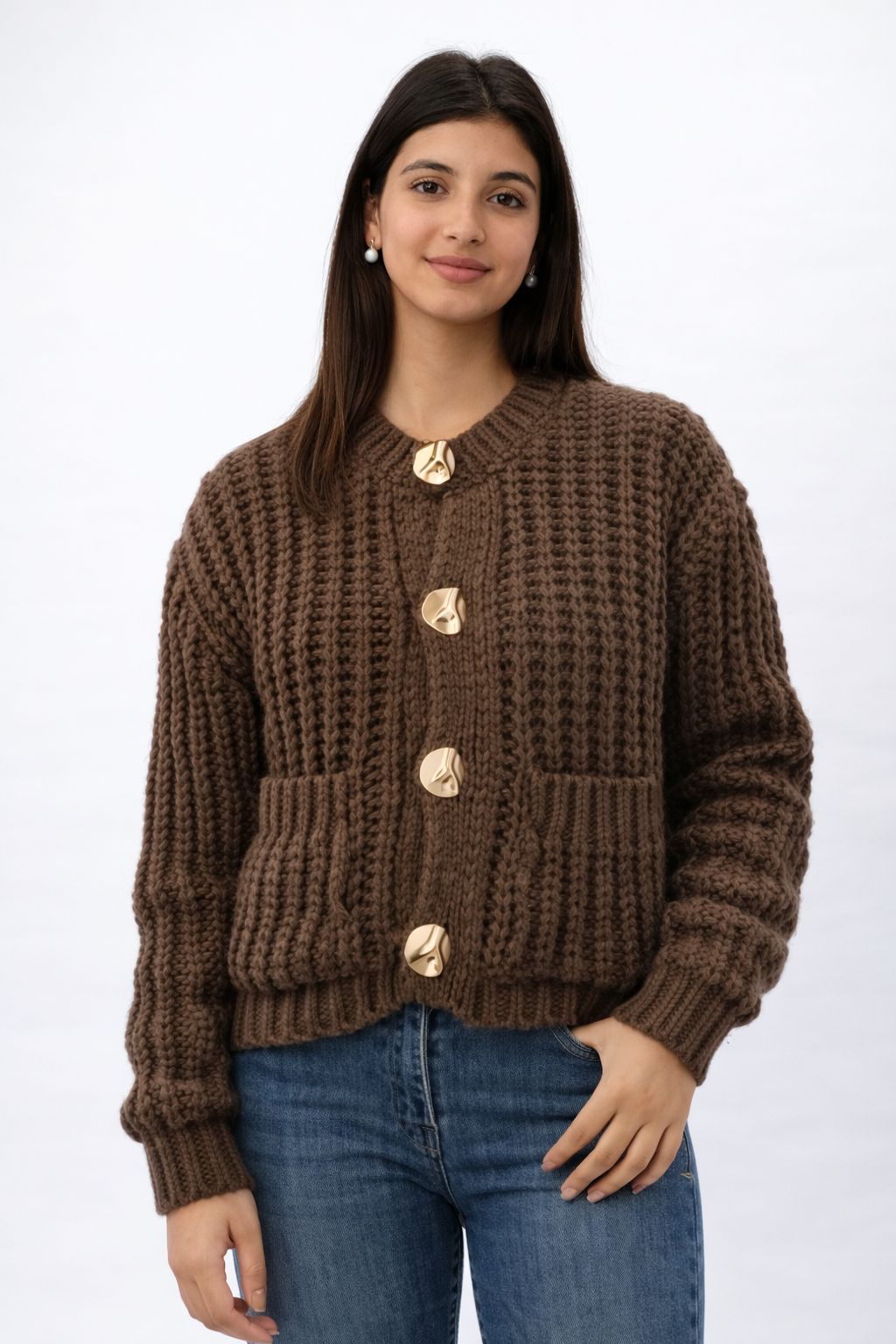 A chunky knit cardigan designed with a textured stitch, statement gold-tone buttons, and front patch pockets. Cozy yet structured, this piece is perfect for everyday layering with a timeless feel.