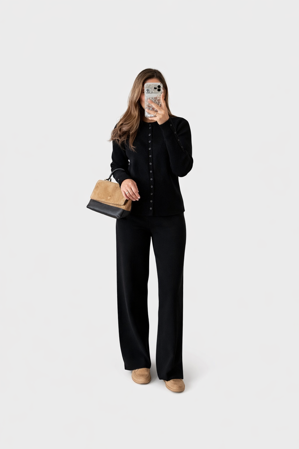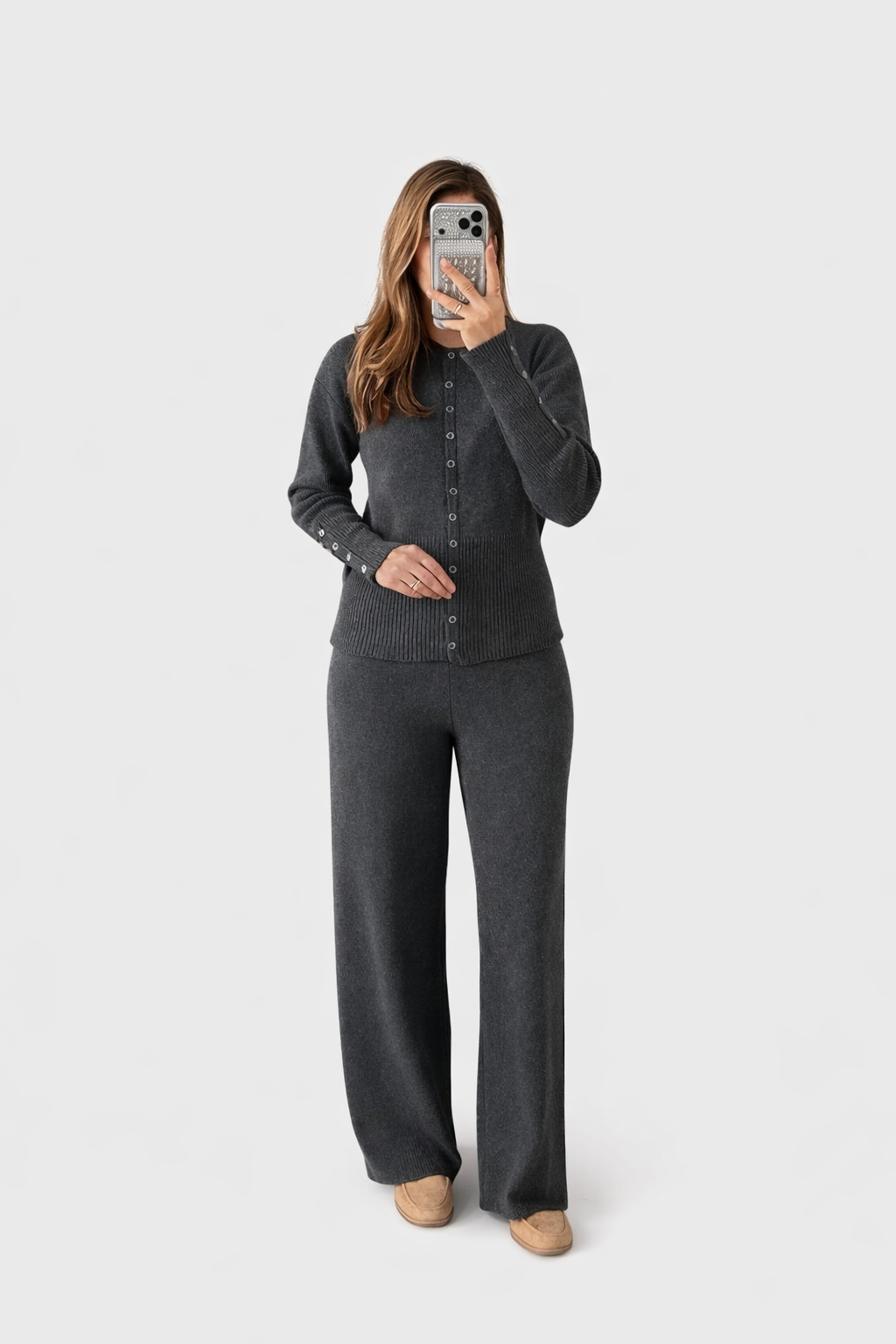 A matching knit set with a button-front cardigan and wide-leg pants.