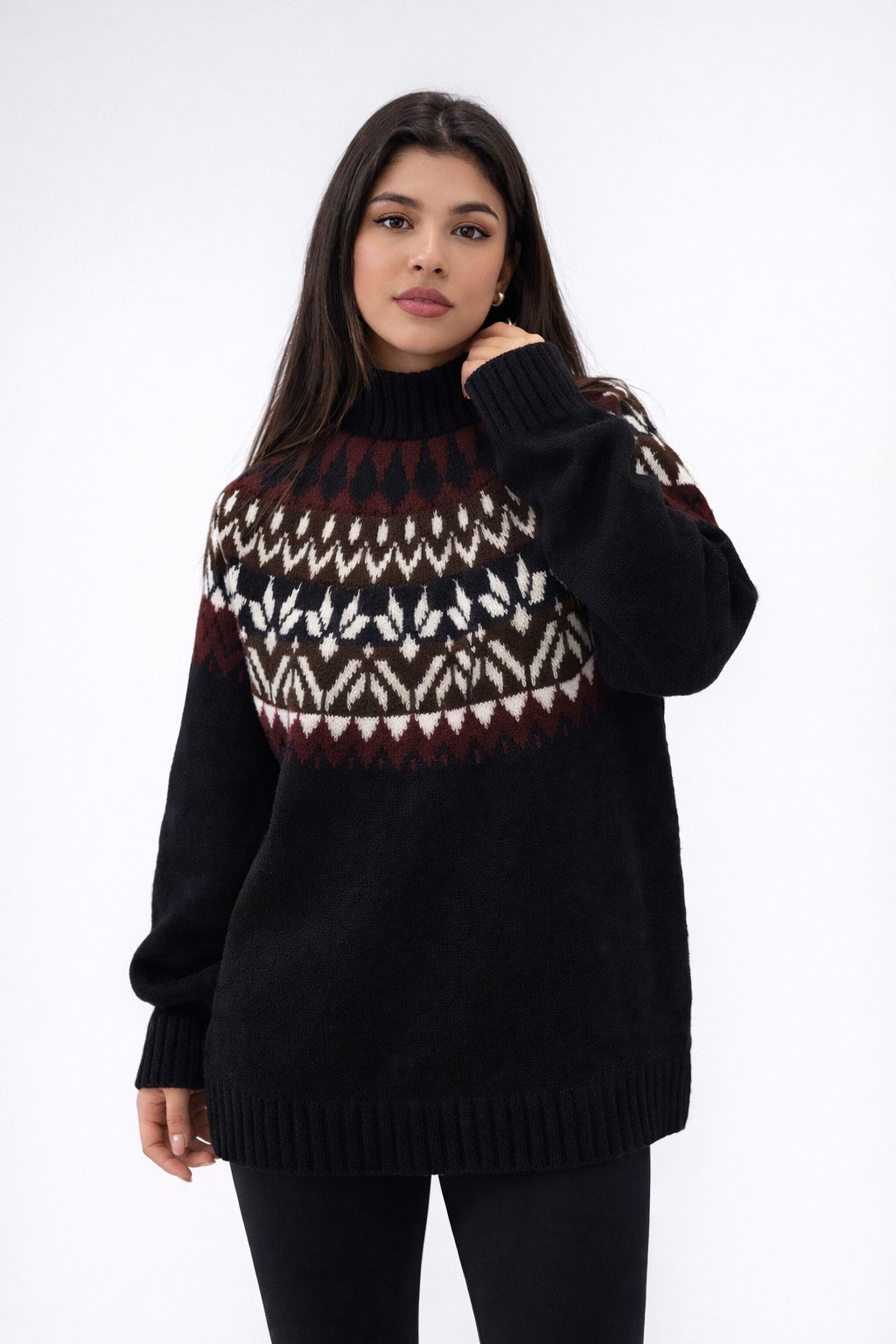 A cozy statement sweater crafted in deep black, accented with warm burgundy, earthy brown, and soft ivory geometric detailing. Designed with a relaxed fit and ribbed high neckline, it blends traditional patterning with a modern, minimal silhouette.