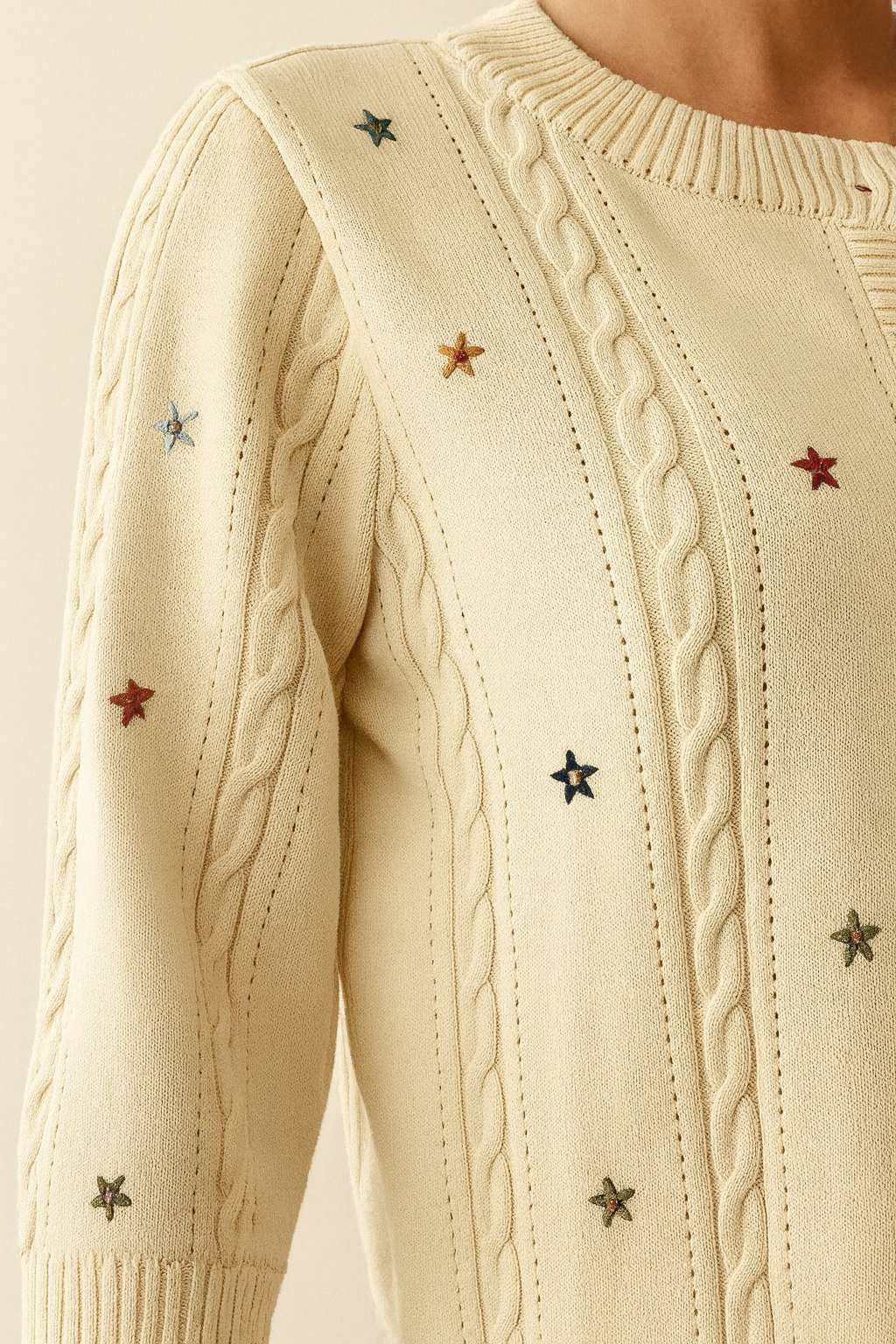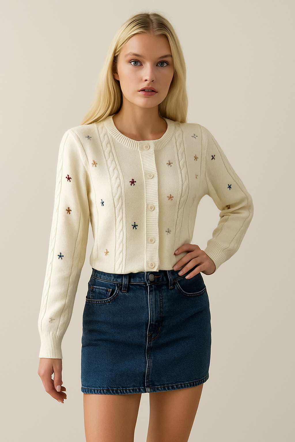 A knit cardigan featuring delicate multicolor embroidered stars and a soft cable-knit texture — a feminine, timeless piece, perfect for layering through every season.